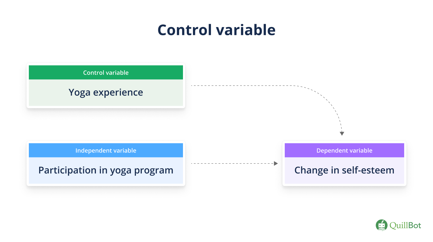 The dependent variable, or the “effect,” is change in self-esteem. You expect participants who complete a yoga program to experience an increase in self-esteem compared to a control group that does not.
