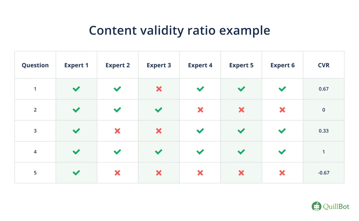 The agreement could be coincidental, so you need to use a critical values table to determine if the content validity ratio for a specific item falls below a minimum value (critical value). If it falls below the critical value, you can’t rule out coincidence.