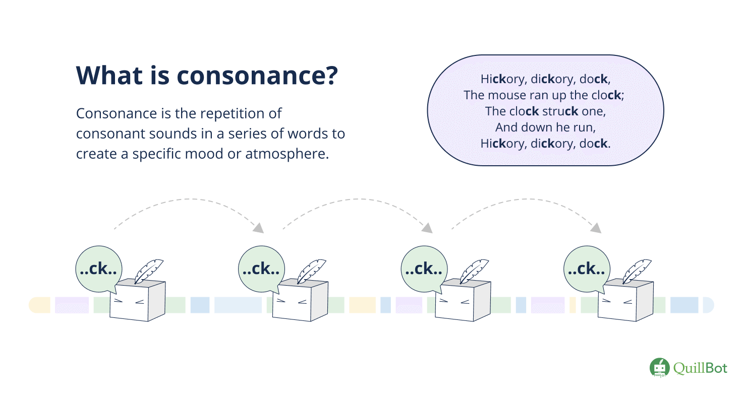Consonance is the repetition of consonant sounds in a series of words, such as “pitter-patter” or “cheeky monkey.” Consonance lends a musical quality to a piece of writing and can be used to create a specific mood or atmosphere.
