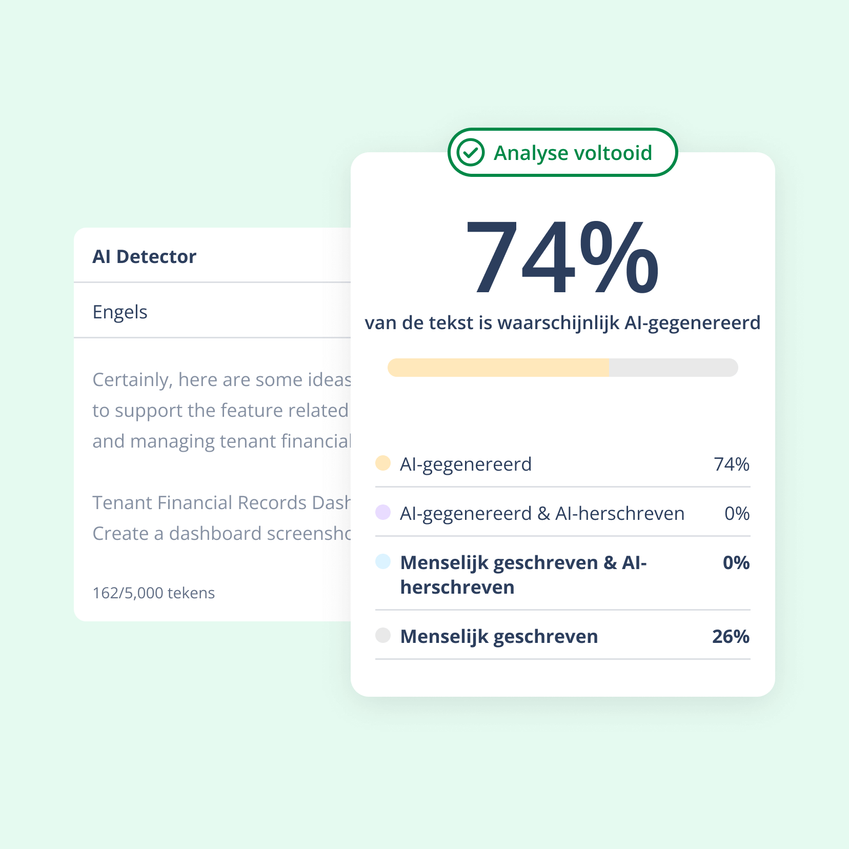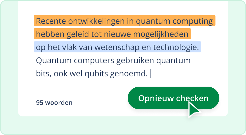 Wanneer het resultaat onduidelijk is, neigt ons model ertoe om teksten als door mensen geschreven te classificeren, wat het aantal valse positieve beoordelingen vermindert. Voor de meest nauwkeurige resultaten analyseer je de volledige tekst in één keer en zorg je ervoor dat deze aan de vereiste lengte voldoet. Interpreteer de resultaten altijd in het licht van je eigen kennis.Voor elke tekst krijg je een waarschijnlijkheidsscore die de waarschijnlijke bron aangeeft. Zoals bij elke AI-detector is deze score geen garantie, maar wel een nuttig signaal wanneer het van belang is wie de tekst heeft geschreven.