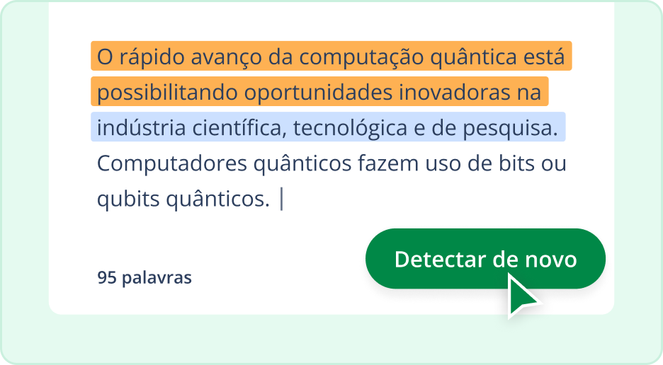 A ferramenta de detecção de IA do QuillBot é treinada com algoritmos avançados para identificar palavras recorrentes, frases estranhas e linguagem artificial, indicadores importantes de que o conteúdo é gerado por IA. Contudo, quanto mais avanços forem feitos nos modelos de IA, haverá menos capacidade de qualquer ferramenta de detecção de IA de distinguir o conteúdo escrito manualmente daquele gerado por IA.